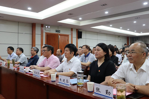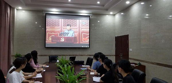 学校领导班子成员、各党总支书记、副书记等人员,在行政楼会议室集中收看了大会直播。全体人员佩戴党员徽章、端坐台下,聚精会神地观看,并不时记录习近平总书记重要讲话内容。