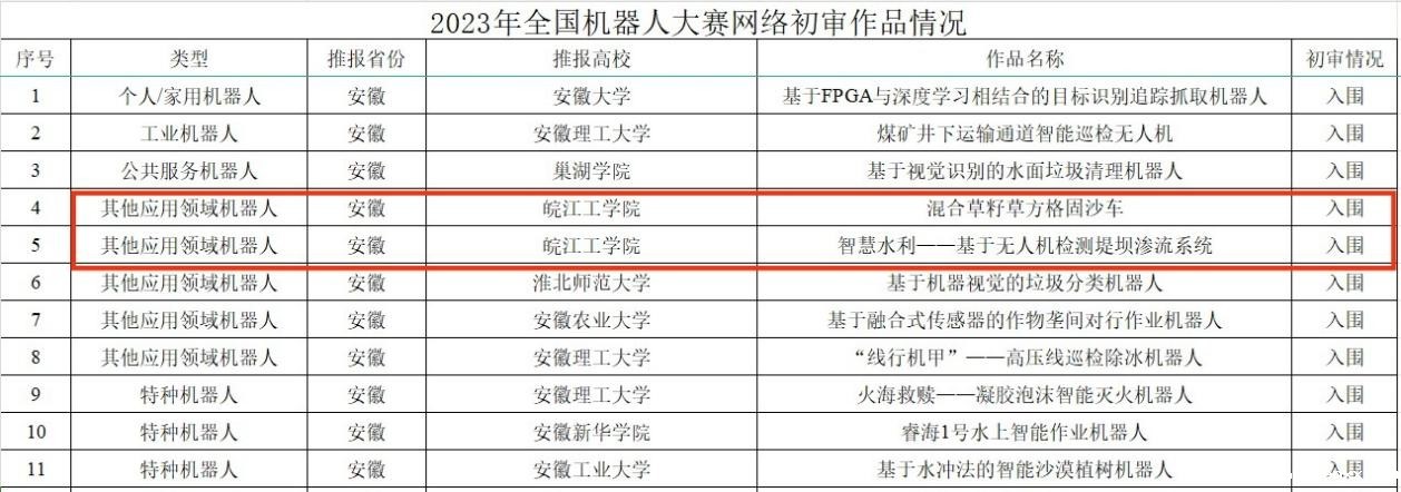 2023年12月17日至19日,由共青团中央、工业和信息化部主办的2023年全国机器人大赛科技创新交流营暨机器人大赛在山东省日照市举办,本次大赛共吸引来自全国30个省、自治区、直辖市及新疆生产建设兵团431所高校的1017件作品参赛。历经省级遴选上报、全国组委会审核,此次大赛共计218件作品入围全国总决赛,安徽省11件,我校《混合草籽草方格固沙车》和《智慧水利— —基于无人机检测堤坝渗流系统》两件作品入围全国终审答辩。经现场激烈角逐,《混合草籽草方格固沙车》荣获国家一等奖,《智慧水利——基于无人机检测堤坝渗流系统》荣获国家二等奖。