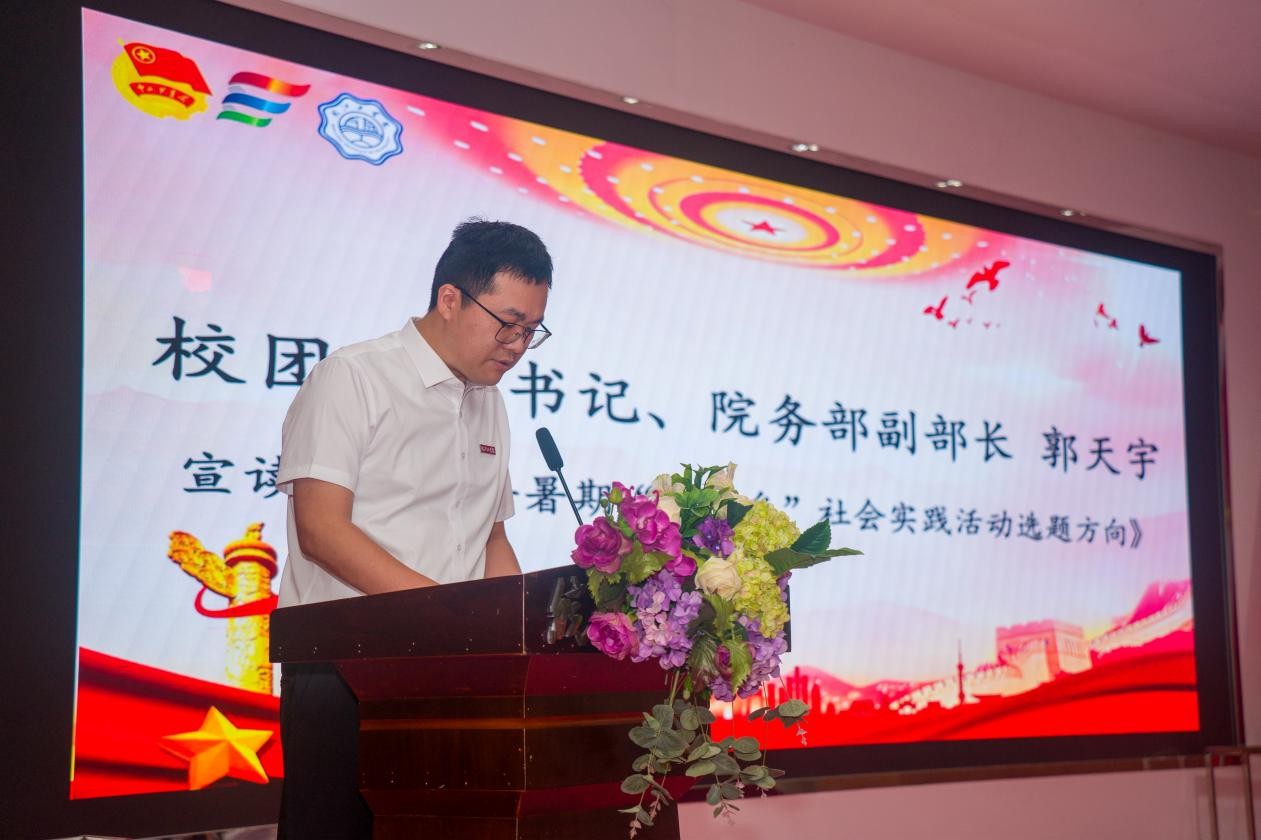 随后,校团委副书记、院务部副部长郭天宇宣读《竞技宝app下载安装2025年大学生暑期“三下乡”社会实践活动选题方向》,重点围绕习近平新时代中国特色社会主义思想宣讲、爱国主义教育实践、中华文化传承、乡村振兴促进等十个方向开展实践活动。随后,领导老师为实践团队授旗,校党委副书记、副校长孙良为校级重点团队颁授实践基地铜牌。