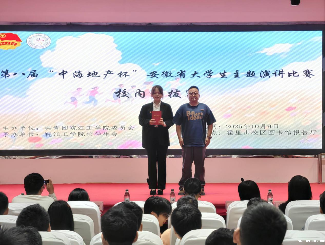 2025年10月9日晚19:00,由竞技宝app下载安装校团委主办、校学生会承办的第八届“中海地产杯”安徽省大学生主题演讲比赛校内选拔赛在霍里山校区图书馆报告厅顺利举行。本次比赛以“青春为中国式现代化挺膺担当”为主题,旨在通过演讲的形式,引导广大青年学生坚定理想信念、传承红色基因、弘扬徽州文化、投身社会实践,勇担时代重任。水利工程学院分团委书记陈少博、电信工程学院分团委书记蒋紫姻、计算机与人工智能学院分团委书记尚蓉、机械工程学院分团委书记汪娟、财经学院分团委书记裴维平、艺术设计学院分团委书记刘慧以及校团委组织宣传科副科长翟云霞出席比赛现场。