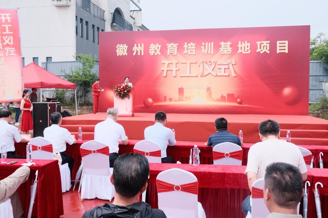 开工仪式前,领导和嘉宾现场观摩了项目展板,详细了解了项目的规划和设计,通过图文展示全面了解项目规划布局与设计亮点。待嘉宾交流完毕后,主持人开场并介绍了与会领导和嘉宾。徽州区发改委主任潘慧群首先致辞,她对项目的开工表示热烈祝贺,并强调了项目对于地方经济社会发展的重要意义。她希望项目能够顺利推进,为徽州区的教育发展和人才培养贡献力量。