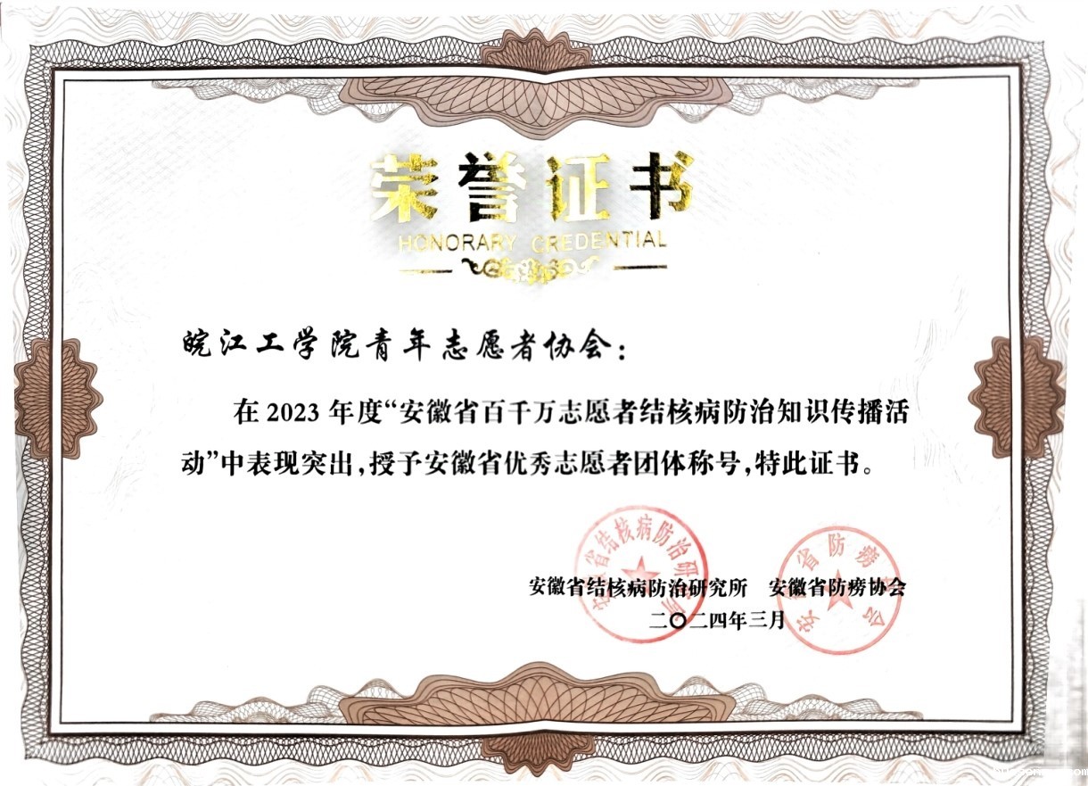 近日,中国疾病预防控制中心、中国健康教育中心公布2023年度全国“百千万志愿者结核病防治知识传播活动提升行动”推选结果,我校青年志愿者协会被评为2023年度“百千万志愿者结核病防治知识传播活动提升行动”国家级优秀志愿者团队称号,并被安徽省结核病防治研究所、安徽省防痨协会评为2023年度“安徽省百千万志愿者结核病防治知识传播活动”省优秀志愿者团体称号。