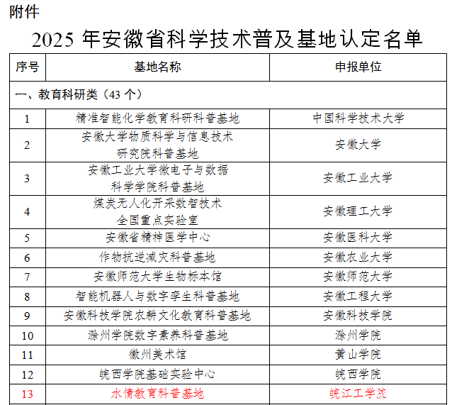 接省科技厅《关于公布2025年安徽省科学技术普及基地认定名单的通知》,我校科技部申报的2025年安徽省科学技术普及基地“水情教育科普基地”经专家评审、公示等程序,已顺利获得安徽省科技厅2025年安徽省科学技术普及基地审批!特此祝贺!(科技部 供稿)