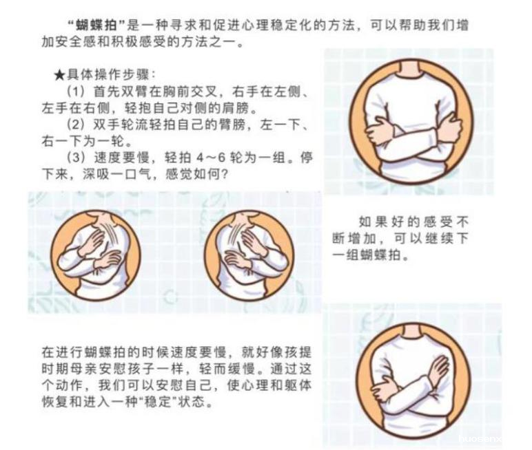 情绪波动时可以使用“蝴蝶拍”的小技术来稳定自己,做法如图: