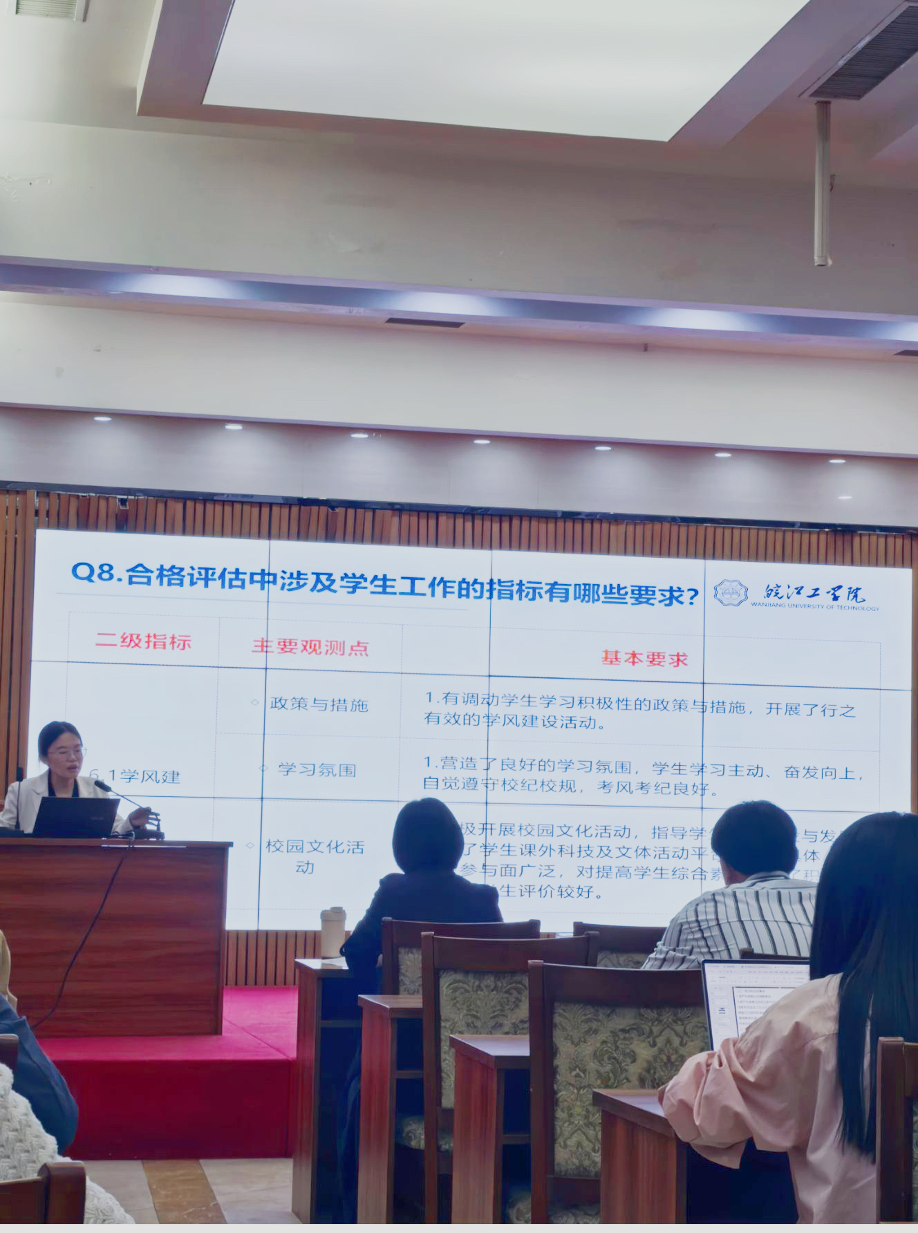 黄翠围绕本科合格评估指标体系,从班主任工作维度切入,强调班主任需在学风建设、学业指导、班级管理中发挥核心作用。她要求全体人员对标自查、补足短板,以高标准迎接评估工作。