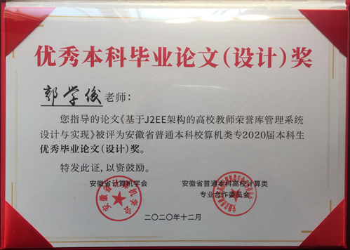 根据安徽省普通本科高校计算机类专业合作委员会(简称省专业合作委员会)关于《优秀毕业设计(论文)评选工作的通知》要求,我校电气信息工程学院向省专业合作委员会报送了2020届计算机科学与技术专业毕业论文材料,经省专业合作委会专家评审、安徽省计算机学会奖励评审委员会评定,孙雨同学的毕业论文《基于J2EE架构的高校教师荣誉库管理系统设计与实现》被评为安徽省普通高校计算机类专业2020届本科生优秀毕业论文(设计)奖,论文指导教师郭学俊副教授获评优秀指导教师奖,安徽省计算机学会(ACF)于2020年12月26日在合肥召开第二届计算机大会暨安徽省普通高校计算机类专业2020届本科生优秀毕业论文(设计)表彰大会,学会理事长陈恩红教授为优秀指导教师颁发了荣誉证书。