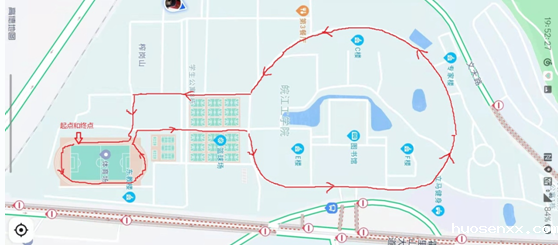 霍里山校区田径场计时台出发绕场地都从田径场门口出→篮球场中间跑到→校环形道→校东门→学校专家楼→教学楼C楼后侧→篮球场西侧道路(靠近宿舍区)→排球场西侧→田径场门口→霍里山田径场计时台。