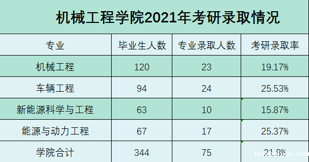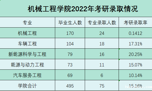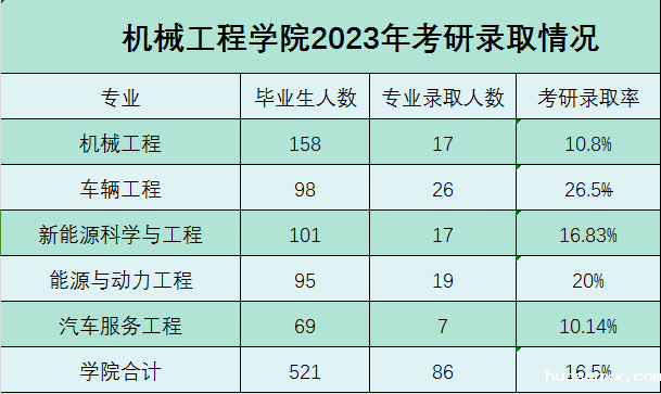 机械工程学院专业设置和人才培养方案符合国家经济及社会发展需求,自办学以来,已有多名学生考上研究生,历年考研率均超过15%,其中部分学生被武汉大学、中国石油大学(北京)、河海大学、合肥工业大学等名校录取。机械工程学院历年毕业生就业率均在95%以上。