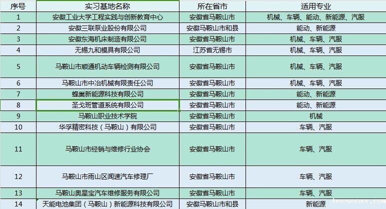 实习基地:安徽工业大学实践与创新教育中心、安徽三联泵业股份有限公司、安徽东海机床制造有限公司、无锡九和模具有限公司、马鞍山市顺通机动车辆检测有限公司、马鞍山市中冶机械有限责任公司、蜂巢新能源科技有限公司等