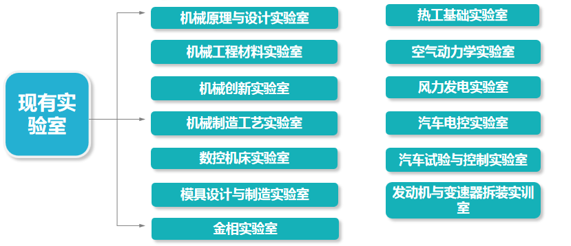 学院现有实验室:机械原理与设计实验室、机械工程材料实验室、机械创新实验室、机械制造工艺实验室、数控机床实验室、模具设计与制造实验室、金相实验室、热工基础实验室、空气动力学实验室、风力发电实验室、汽车电控实验室、发动机与变速器拆装实训室、汽车试验与控制实验室等20个实验室。在建实验室有:汽车驾驶模拟实验室、汽车底盘实验室、太阳能发电实验室、能源与动力工程综合实验室等。