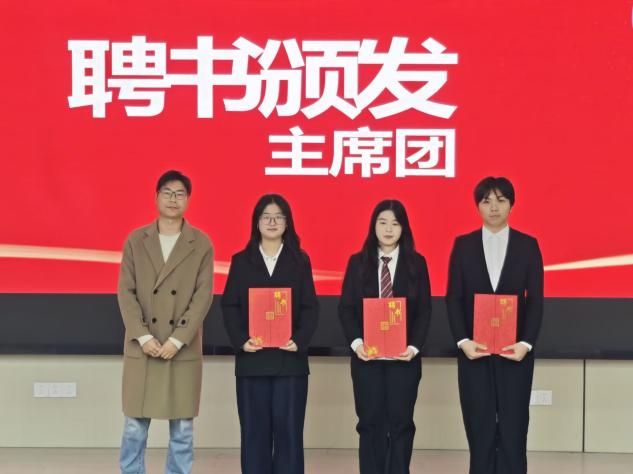 李明仁宣读第六届学生会主席团、学生委员和学生书记任命名单,汪紫昕、张萱等同学当选;石榕凤主席宣读第六届部长任命名单,确定七个部门正副部长人选,新一届核心成员依次上台接受任命书并合影。