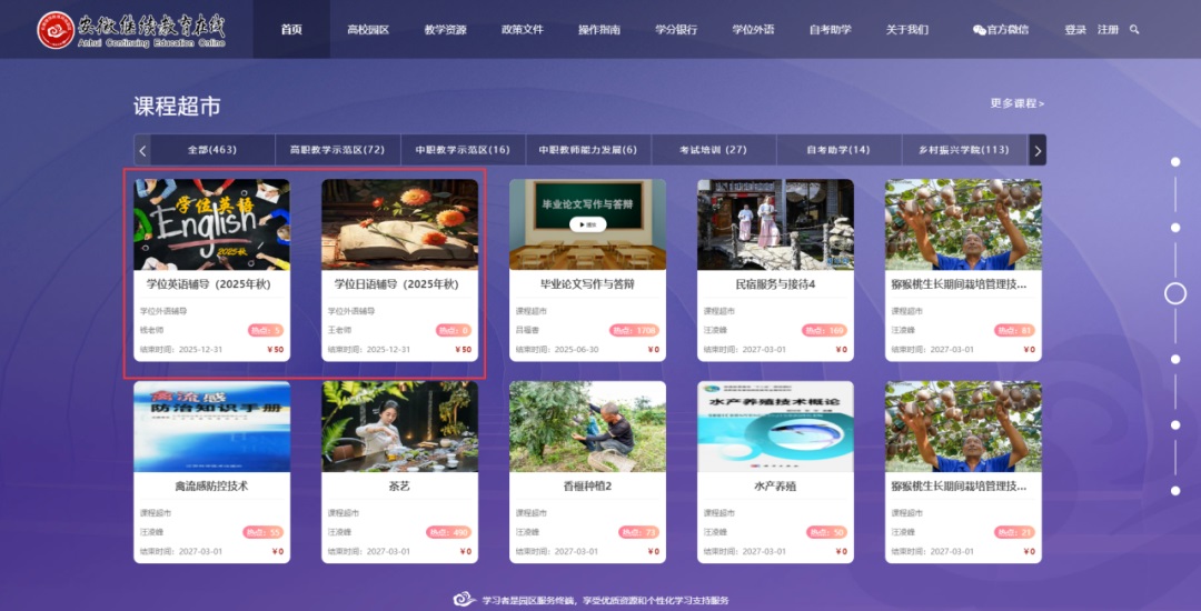 计划报考学位外语网考的考生均可按需选学,请选学考生登录安徽继续教育在线平台,在课程超市中选择“学位英语辅导(2025年秋)”“学位日语辅导(2025年秋)”参照学位外语辅导课程选学操作指南进行选课学习。