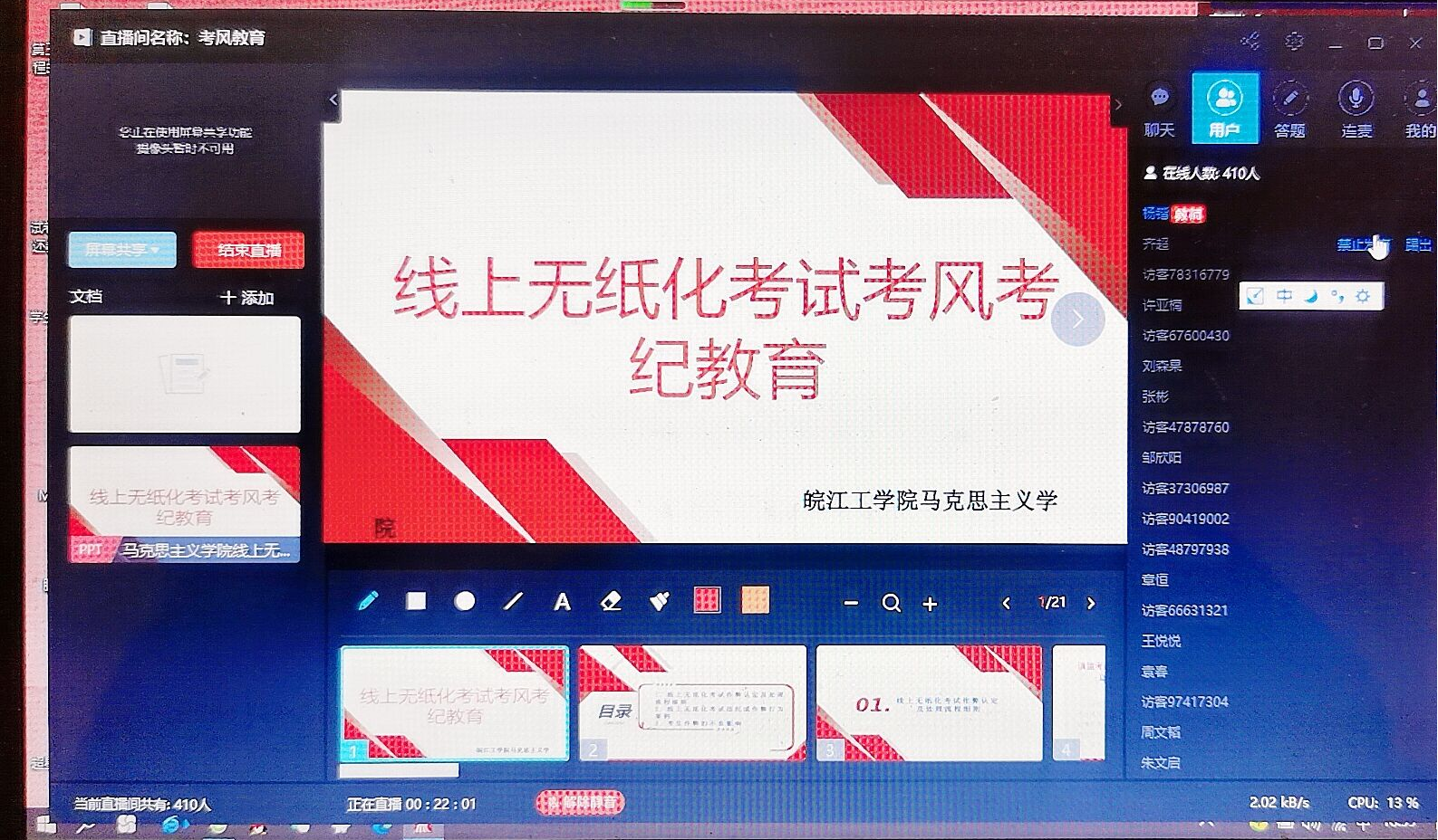 2024年1月2日晚,张春艳老师在超星直播平台开展考风考纪教育会,宣读了线上无纸化考试作弊认定及处理流程细则,阐明作弊行为的性质及危害,强调了诚信考试的重要性。张春艳强调,一是要树立正确的考试观念,明确考试的目标和要求,认真对待每一场考试;二是要严格遵守考试纪律,不作弊、不抄袭,自觉维护考试的公平性和公正性;三是要加强自我管理,合理安排复习时间,牢固掌握所学知识,保持良好的心态和状态,考出优异的成绩。