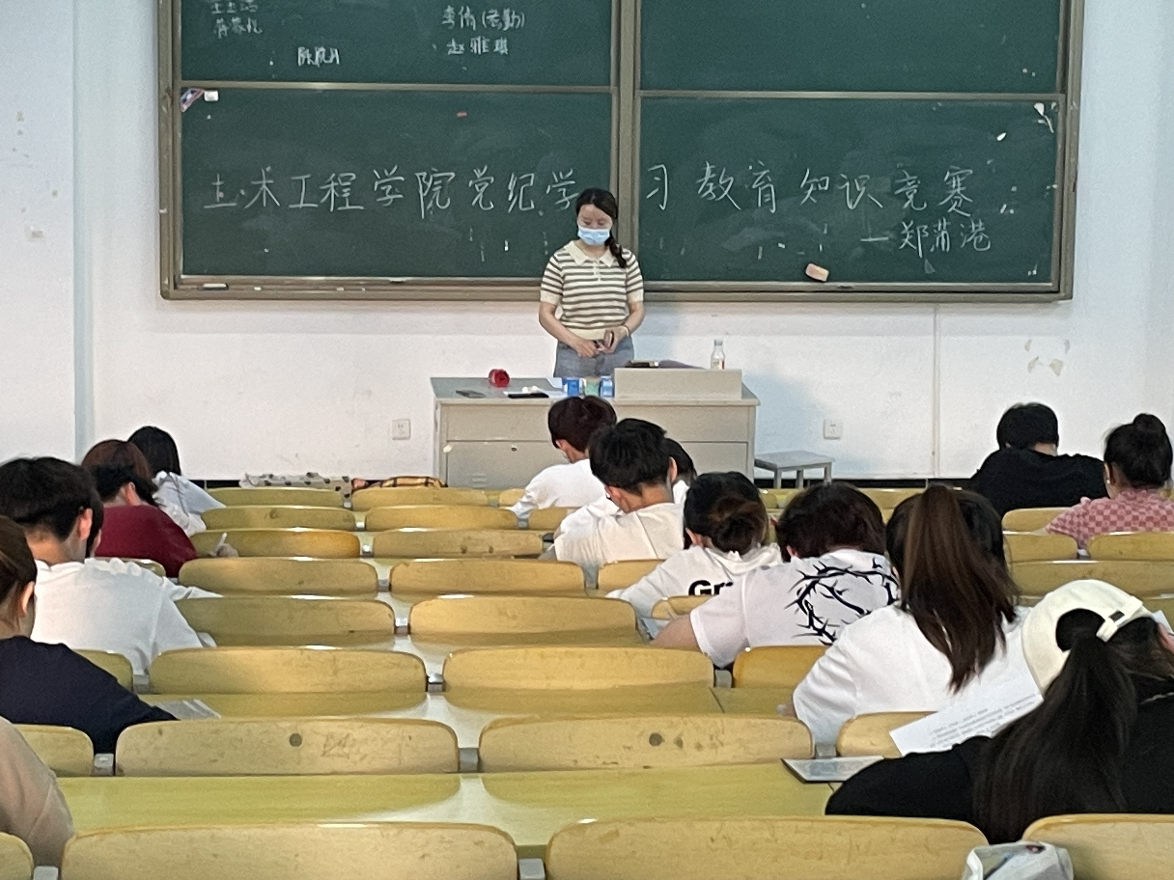 为深入学习领会习近平总书记关于党纪学习教育的重要讲话和重要指示精神,推动全院师生对《中国共产党纪律处分条例》的深入学习,土木工程学院于5月17日举办“学纪律、知敬畏、守底线、作表率” 学习《中国共产党纪律处分条例》(以下简称《条例》)知识竞赛。竞赛由学院党总支主办,学院学生第一党支部承办。竞赛启动以来,受到学院师生党员、发展对象和积极分子的积极响应,共有140人报名参赛,其中霍里山校区56人,郑蒲港校区84人。